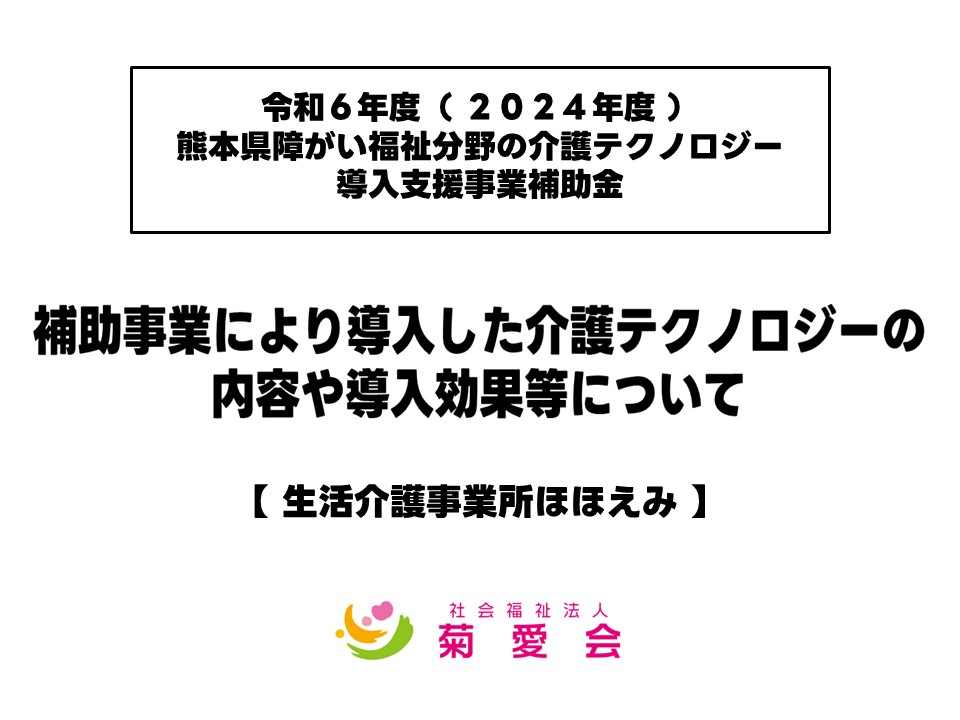 補助事業により導入した介護テクノロジーの内容や導入効果等について 2026.03.17 令和6年度(2024年度)熊本県障がい福祉分野の介護テクノロジー導入支援事業補助金において、交付要領の規定に基づき、当該補助事業により導入した介護ロボット等の内容や導入効果等について公表いたします。 ・事 業 所 生活介護事業所ほほえみ ・機器の種別 ソフトウェア及び情報端末 ・機 器 名 記録システム及びタブレット端末(5台)